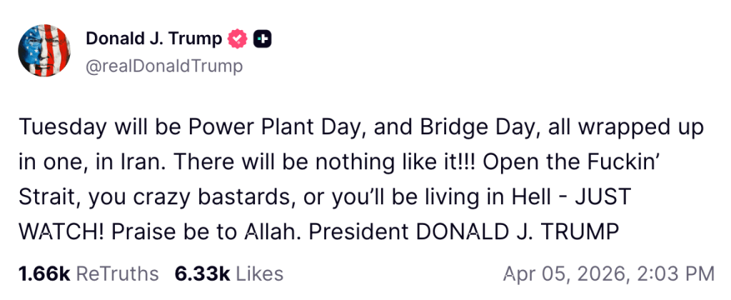 “Tuesday will be Power Plant Day, and Bridge Day, all wrapped up in one, in Iran. There will be nothing like it!!! Open the F****in’ Strait, you crazy bastards, or you’ll be living in Hell – JUST WATCH! Praise be to Allah,” the president said in a Truth Social post mocking the Islamist regime’s islamic, jihadist faith.