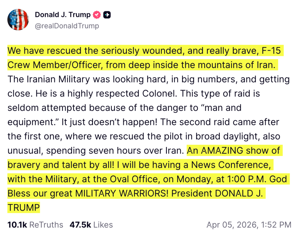 President Trump reported today that the Second, Brave Pilot of the downed F15E downed over Iran, who was seriously wounded, was rescued today.
