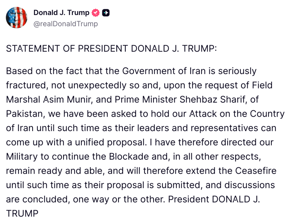 President Trump Mixed Signals: Breach of Ceasefire by Iranians — AND — Return of Negotiators in Islamabad tonight.